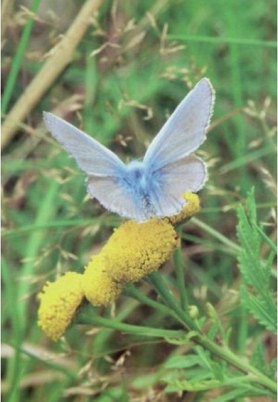 Een blanco wenskaart met een natuurlijke afbeelding van paardebloemen in het gras waar een blauwe vlinder op zit.Een dubbele wenskaart inclusief envelop en in folie verpakt.