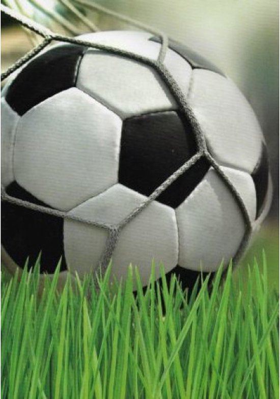 Een blanco wenskaart waarop een mooie voetbal in het gras te zien is.Voor de echte voetballiefhebbers is het doelpunt al gemaakt.