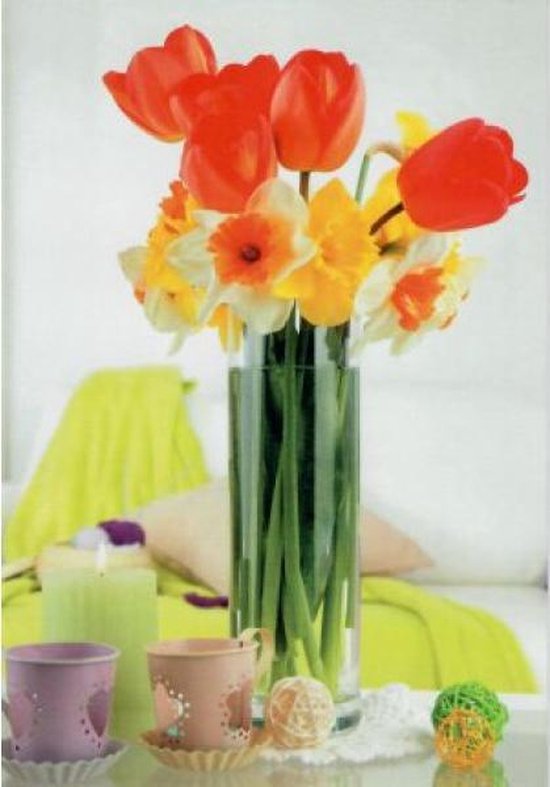Een fleurige wenskaart met vrolijk gekleurde narcissen en tulpen in een glazen vaas.Een dubbele wenskaart inclusief envelop en in folie verpakt.