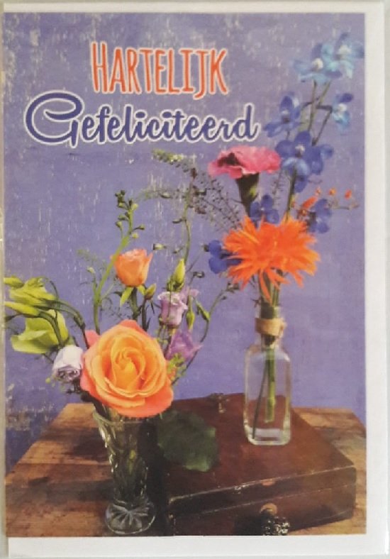 Hartelijk gefeliciteerd!Een bijzondere wenskaart met twee vaasjes waar kleurrijke en verschillende bloemen in staan.