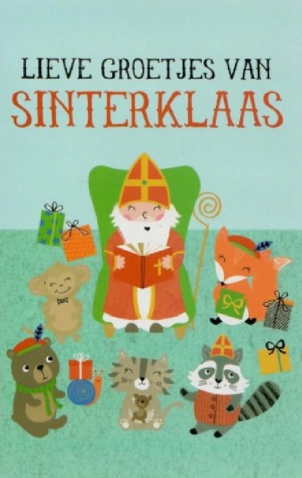 Lieve groetjes van Sinterklaas! Een lieve wenskaart met verschillende dieren en cadeautjes om sinterklaas heen. Een dubbele wenskaart inclusief envelop en in folie verpakt.Specificaties