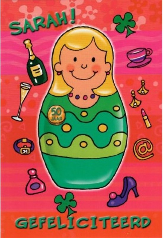 Een vrolijke wenskaart met allerlei spullen om Sarah heen die zij goed kan gebruiken.